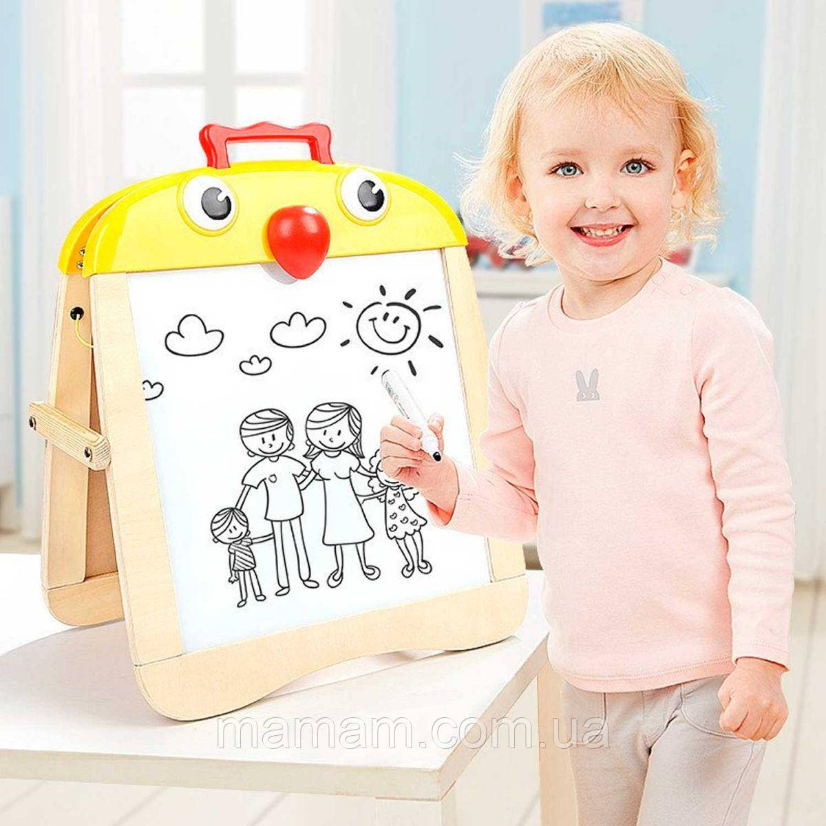 Мольберт Top Bright 120300 — це двостороння дерев'яна дошка для малювання для дітей старше 3 років. Являє собою розкладається драбиною підставку з металевими полотнами для малювання двох кольорів: біле полотно для малювання маркерами, чорне — крейдою. Як губки–гумки для маркерної дошки використовується дзьоб пташеня. Розвиває дрібну моторику і уяву, прискорює вивчення букв і цифр.